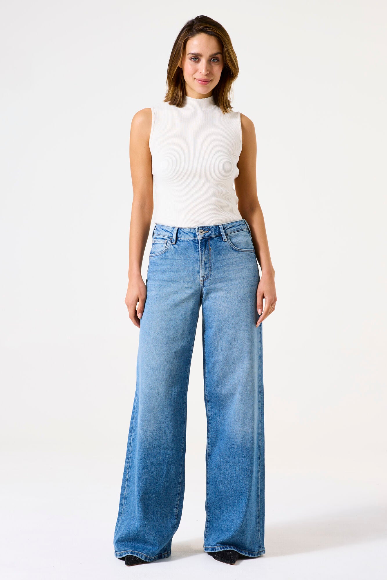 The Celia is a classic 5-pocket jeans with wide legs. This jeans has a high waist and a button and zip closure.