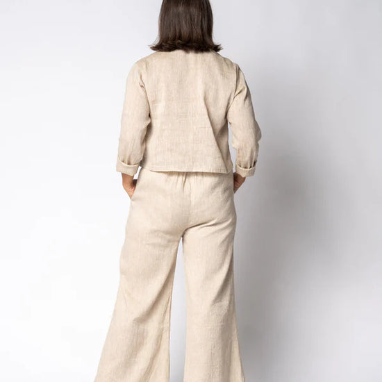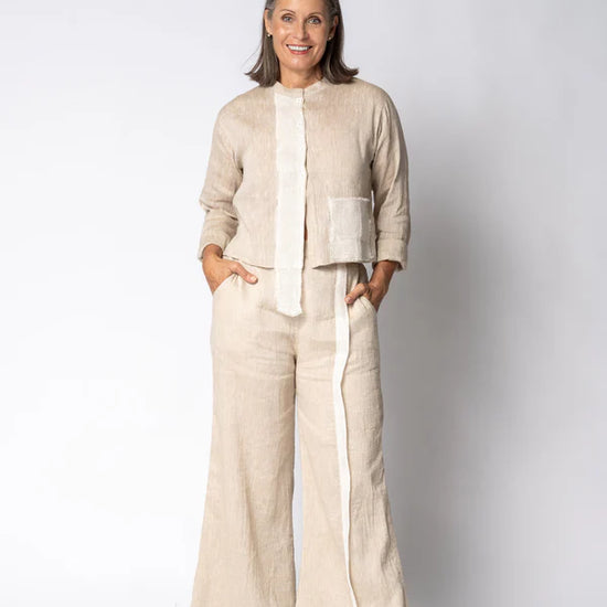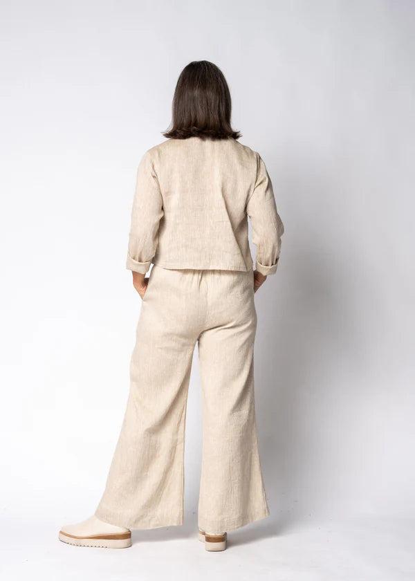The Nova Linen Pants in Latte are the epitome of effortless elegance and luxury. Designed with a relaxed fit, these pants feature a flattering elasticated waistband at the back for a comfortable and flexible fit. A simple sleek trim running down one leg and fully lined, adding a touch of understated sophistication. Finished with classic side pockets for practicality, these pants combine style and comfort for every occasion. The Nova Pants are an essential piece for those who appreciate timeless, versatile fashion.